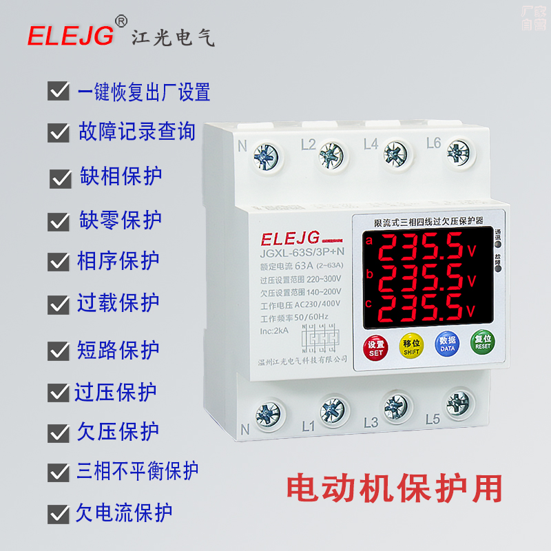 三相四线限流式过欠压保护器采用模块化的产品结构型式,具有体积小、可靠性高,操作方便等优点。产品主要功能有:过电压、欠电压、断相缺相、断零线缺零线、过电流、瞬时短路、三相不平衡、欠电流、相序、RS485通讯、一键恢复出厂设置等功能,广泛用于:电信、冶金、煤矿、钢铁、石化、港口、船舶、铁路、医院、智能楼宇等领域的配电和电动机保护控制系统。